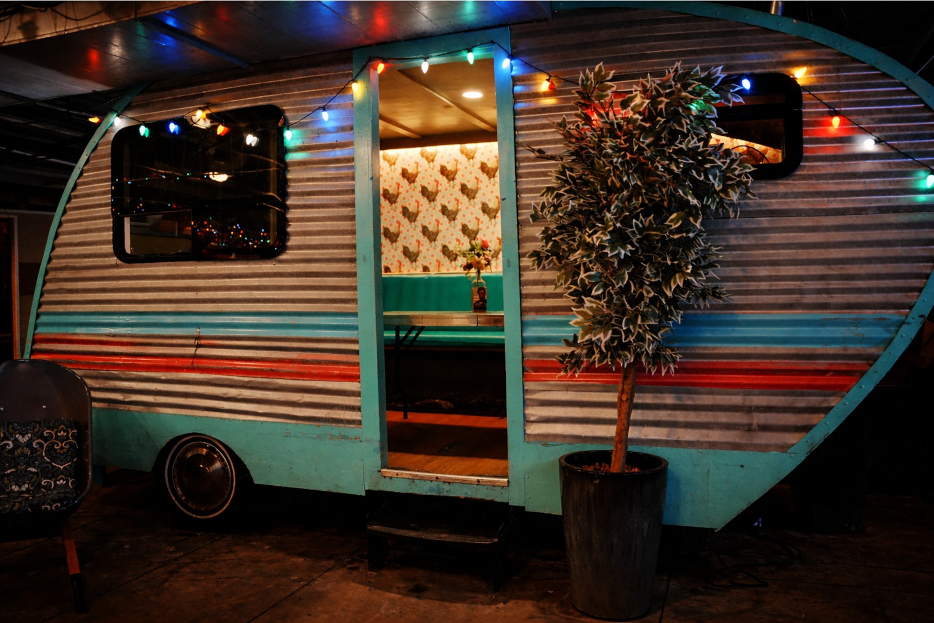 Our largest trailer and the crown jewel of TPAD. The 70s trailer packs in up to 25 guests for a full-on disco-era blowout — complete with that iconic rooster wallpaper, teal booth seating, and string lights that hit just right. This is the one for the big celebrations.
